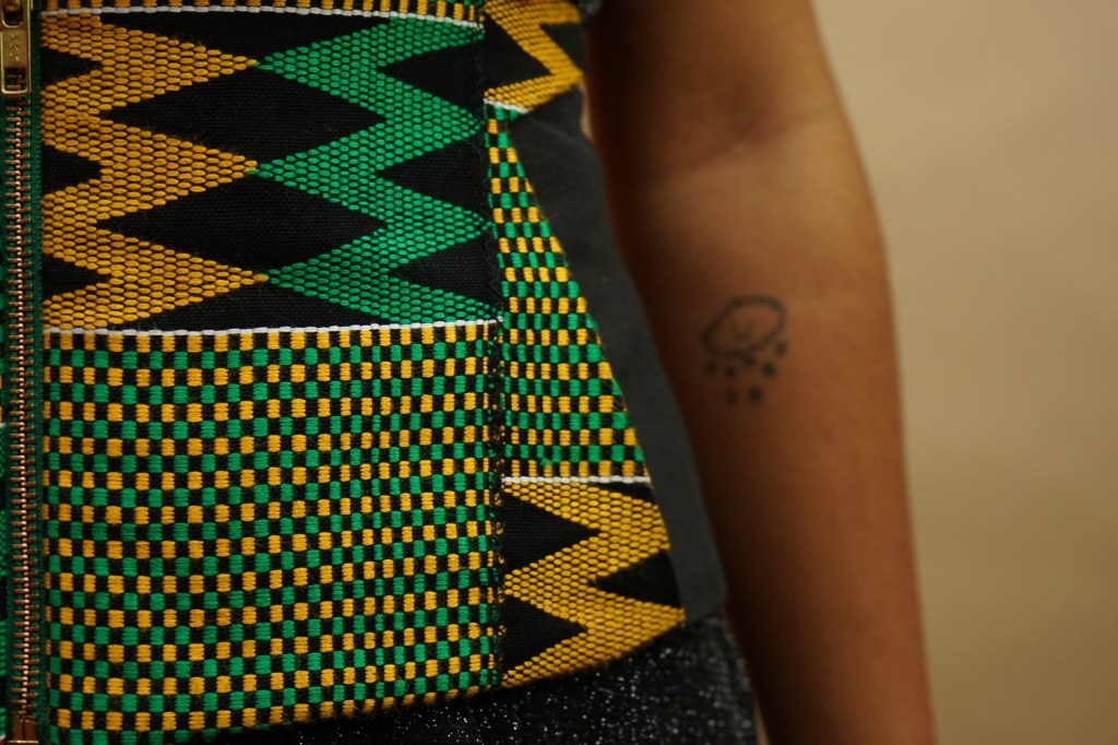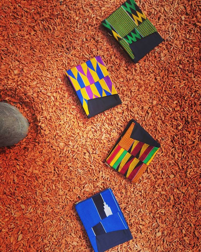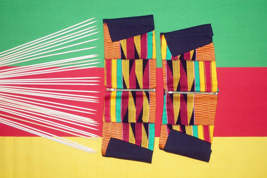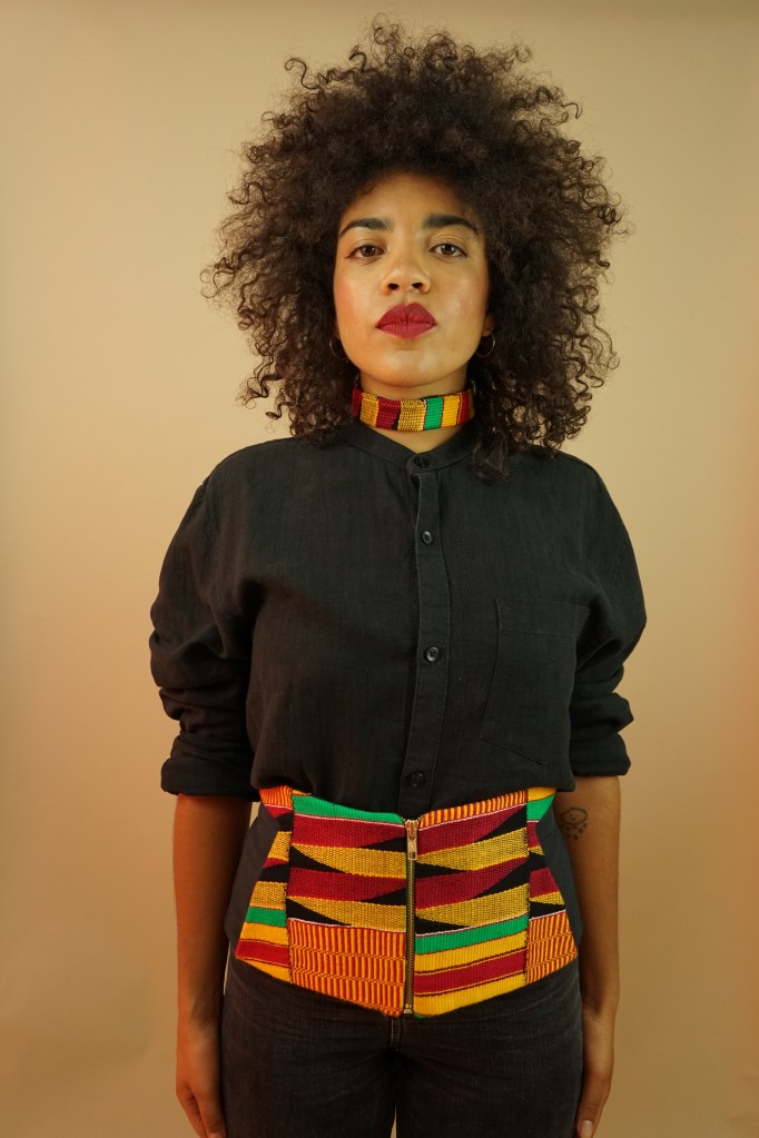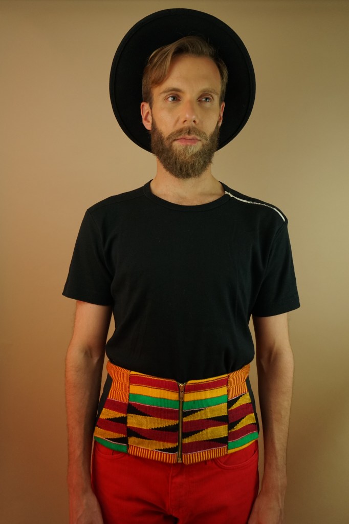 La ceinture est donc la fusion entre un bandeau de smoking et des poches de hoodie. Elle est bi-matière en Kenté et en coton. Raymond, styliste et couturier, rencontré par le biais de Ferouz Allali une créatrice algérienne, s’occupe de l’assemblage des ceintures (Kenté, coton, boucle et fermeture éclair). Raymond transmet son savoir-faire comme Godwin afin de lutter contre le sous emploi et le chômage au Togo.