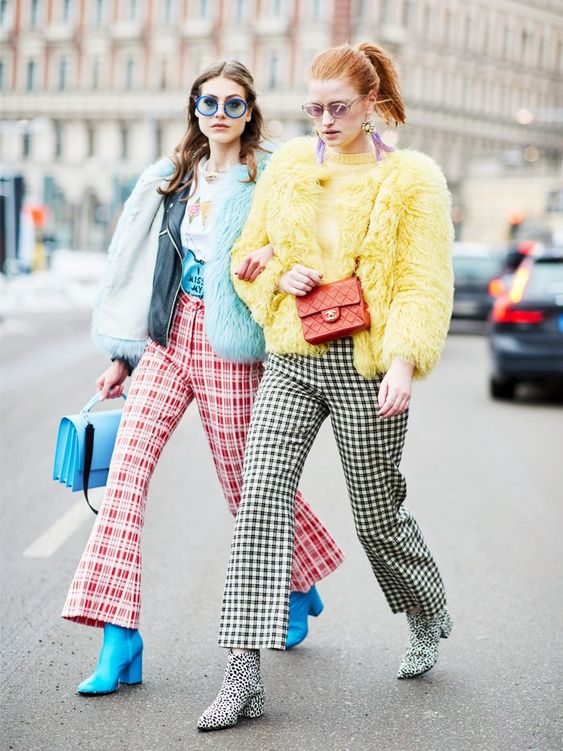 La coupe du pantalon (patte d’eph) et les motifs, la couleur des manteaux ainsi que leur matières, le sac (the access pour habiller la tenue), les bottes originales et pour finir les lunettes… On ne pouvait pas faire sans.