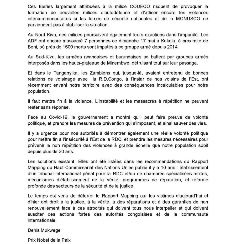 Le Docteur Denis Mukwege, prix Nobel de la paix 2018 rappelle dans un communiqué daté du 18 mai 2020 que la pandémie Covid-19 ne doit pas nous faire oublier les massacres endémiques en République Démocratique du Congo.