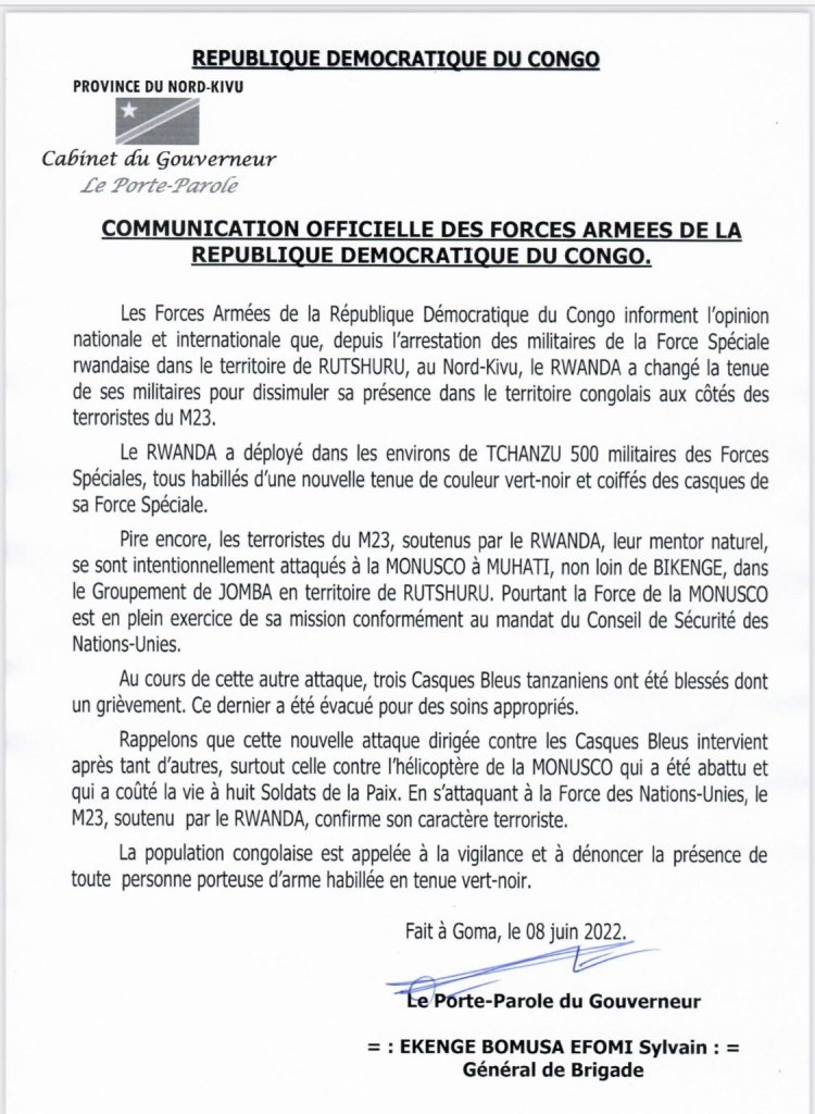 Un communiqué des forces armées de la RDC a annoncé que « depuis l’arrestation des militaires rwandais au Nord-Kivu, le Rwanda a changé la tenue de ses militaires pour dissimuler sa présence dans le territoire congolais aux côtés des terroristes du M23.«