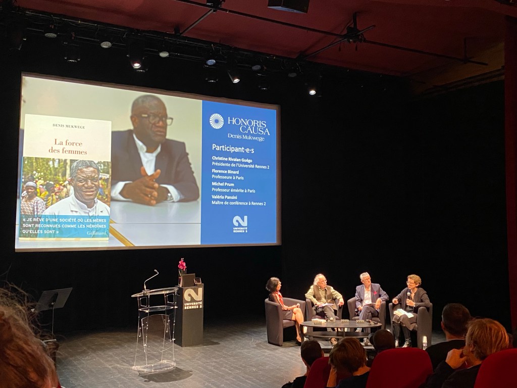 La cérémonie s’est ainsi achevée par les éloges de Renée Dickason, professeure en civilisation et histoire contemporaine – histoire culturelle et médias britanniques et Jean-Philippe Harlicot, gynécologue au CHU de Rennes, qui a su apporter une touche d’humour tout en revenant sur le travail remarquable du Dr Mukwege en proposant un traitement holistique.